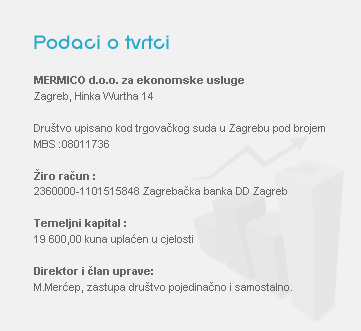 Mermico d.o.o. registriran je pri trgovačkom sudu u Zagrebu pod punim nazivom Mermico d.o.o. za ekonomske usluge 1992 godine a sa poslovanjem započinje 1993 godine.